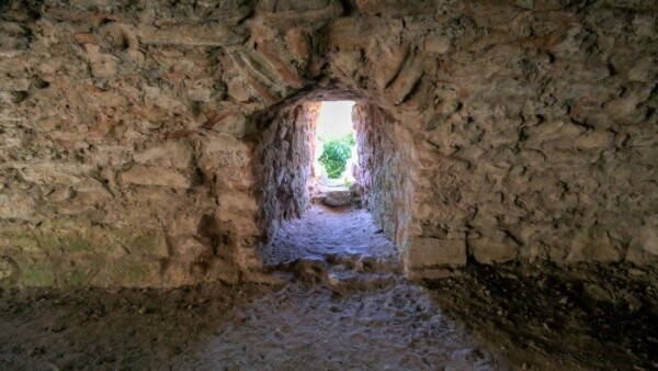 Die beiden Spurrinnen am Boden der Kammer kennzeichnen der Rücklaufweg der Lafette nach dem Abfeuern der Kanone. Entsprechend der Höhe der Schießöffnung handelte es sich bei dem hier eingesetzten Geschütz um eines auf einer (Kasematt-)Lafette, wie man sie von Kriegsschiffen her kennt. Das erhöhte zwar die Sicherheit der am Geschütz arbeitenden Geschützbedienung schränkte aber gleichzeitig den Seitenrichtbereich im Feuerkampf ein.