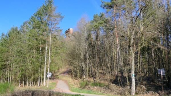Die Burgruine Drachenfels liegt etwa 1 km Luftlinie südlich der Ortschaft Busenberg im Landkreis Südwestpfalz.