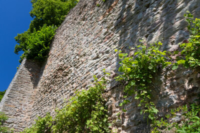 Die sauber geschichtete Mauer des quadratischen Vorbaus an der Schildmauer wurde saniert und mit einer Pforte versehen.